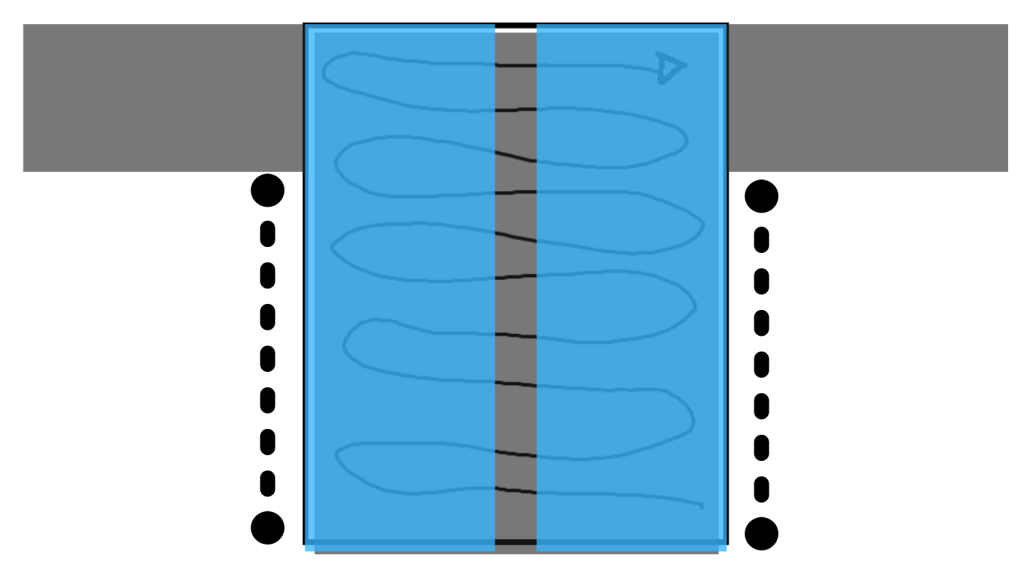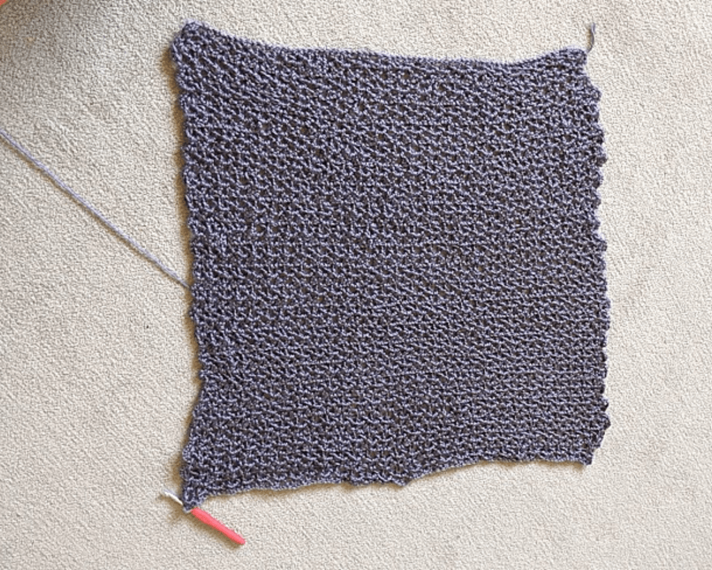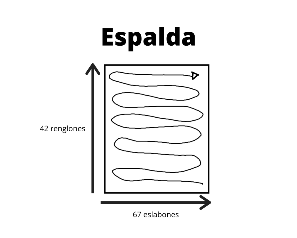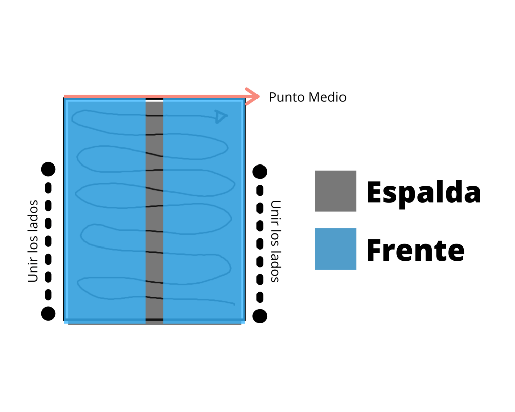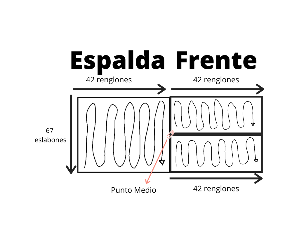 Una vez terminado el cuadro, se marca el punto medio y se van a sacar dos rectángulos por separado de 42 renglones cada uno y con las mismas puntadas, estos van a ser el frente de la prenda.