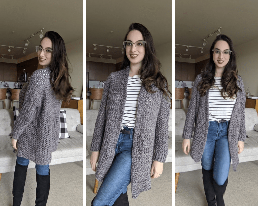 Vamos a hacer fast-forward a hace tres semanas. Estaba buscando ropa de invierno en internet, porque acá ya cambió el clima y como que se antoja vivir en un suéter calientito. En eso estaba cuando encontré dicho suéter en amazon, y tuve un pensamiento en cuanto lo vi, ese pensamiento que es responsable de mi cajonera llena de materiales, de mis viajes al Michael’s y de mi terquedad: “yo puedo hacer eso”. Seguido de: “¿qué tan difícil puede ser tejer un suéter?“. Así que sin dedicarle mucho tiempo a pensar que la gente normal inicia a tejer haciendo una bufanda y no un suéter, me puse a investigar como tejerlo, encontré un tutorial que se veía fácil de seguir, vi los materiales y esa misma tarde a mi puerta llegaron 3 bolas de estambre y un set de ganchos (es una maravilla esto de amazon prime).